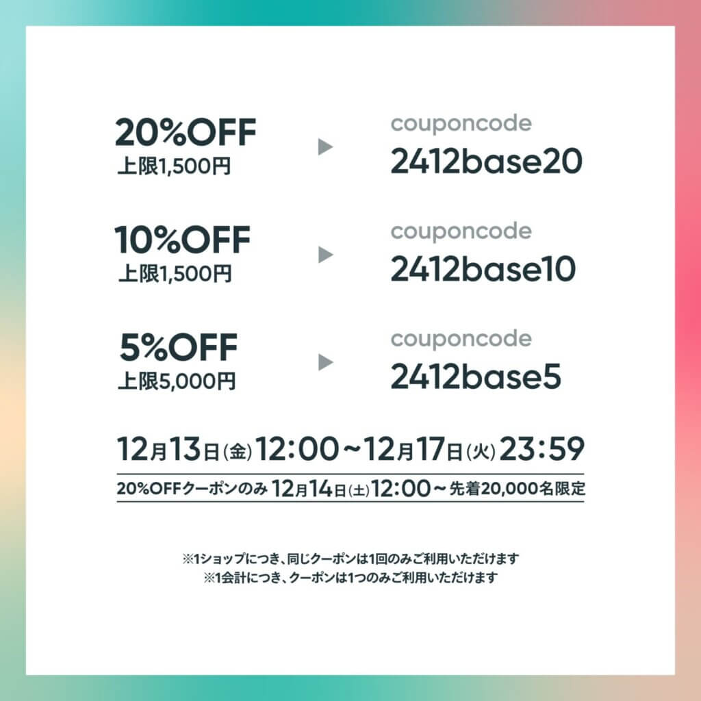 このキャンペーンでは、BASEで出店しているお店で購入する際に、特別なクーポンコードを入力するだけで、最大20%の割引が受けられます!